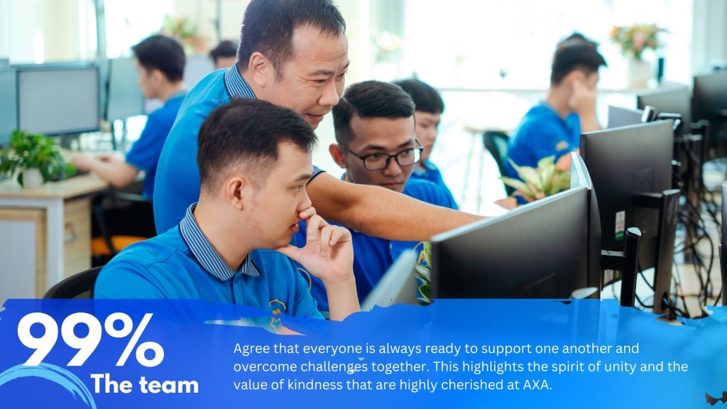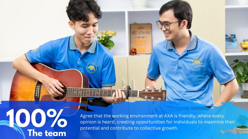- 100% thành viên đồng ý rằng môi trường làm việc tại AXA thân thiện, nơi mọi ý kiến đều được lắng nghe và tôn trọng.
