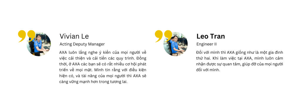 AXA có lộ trình thăng tiến rõ ràng cũng như kế hoạch cho đội ngũ kế thừa, đảm bảo sự thăng tiến cho các cá nhân nỗ lực. Mọi đóng góp, sự cố gắng và nỗ lực của các thành viên luôn được ghi nhận, trân trọng và đánh giá cao.